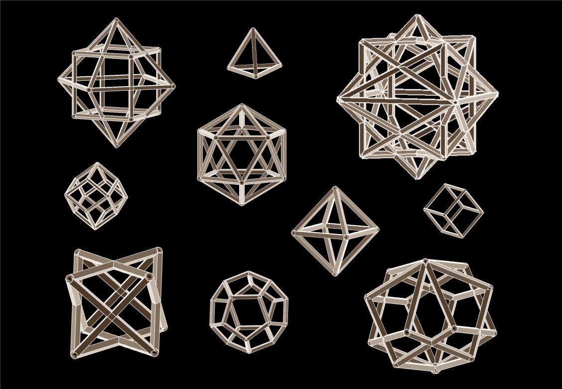 The base shapes are ancient. They include Plato's five Platonic solids: tetrahedron, cube, regular octahedron, dodecahedron, and icosahedron. Johannes Kepler also drew five Platonic solids in his book Harmonice Mundi.